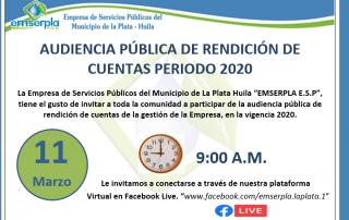 Convocatoria pública de rendición de cuentas vigencia 2020 La Empresa de Servicios Públicos del Municipio de La Plata Huila, convoca a la comunidad en general, a participar de la audiencia pública de rendición de cuentas de