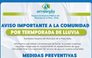 Estimados usuarios del Municipio de la Plata Huila. Informamos que debido a la temporada de lluvias, se pueden ocacionar crecientes inesperadas en nuestra fuente de abastecimiento de agua. Esto puede llevar a la suspensión del servicio de