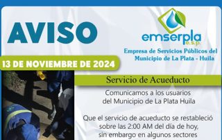 Comunicamos a los usuarios del Municipio de la Plata Huila, que el servicio de acueducto se restablecio sobre las 02:00 AM del dia de hoy, sin embargo en algunos sectores nos les ha llegado el servicio, debido