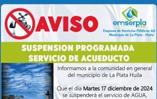 Informamos a la comunidad en general del Municipio de la Plata Huila, que el día martes 17 de diciembre de 2024 se suspenderá el servicio de AGUA, debido a trabajos de mantenimiento de las estructuras que conforman