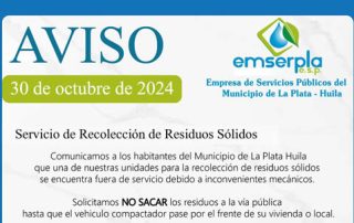 Comunicamos a los habitantes del Municipio de la Plata Huila que una de nuestras unidades para la recolección de residuos sólidos se encuentra fuera de servicio debido a inconvenientes mecanicos.Solicitamos NO SACAR los residuos a la vía pública