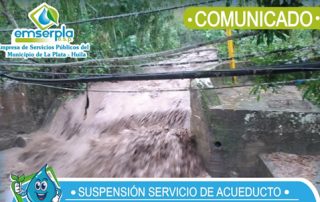 Se informa a la comunidad del Municipio de la Plata Huila, que el servicio de acueducto se encuentra suspendido debido a las fuertes lluvias presentadas en las últimas 24 horas, lo que ha ocacionado daños en la