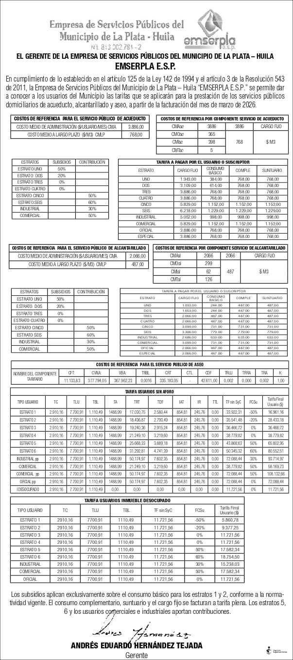 En cumplimiento de lo establecido en el artículo 125 de la Ley 142 de 1994 y el artículo 3 de la Resolución 543 de 2011, la Empresa de Servicios Públicos del Municipio de La Plata – Huila “EMSERPLA E.S.P.” se permite dar a conocer a los usuarios del Municipio las tarifas que se aplicarán para la prestación de los servicios públicos domiciliarios de acueducto, alcantarillado y aseo, a partir de la facturación del mes de marzo de 2026.