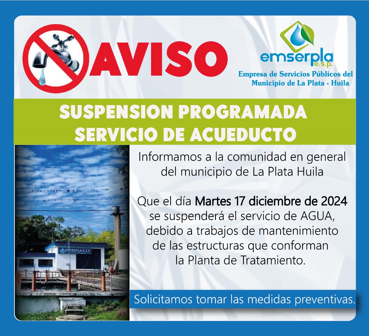 Informamos a la comunidad en general del Municipio de la Plata Huila, que el día martes 17 de diciembre de 2024 se suspenderá el servicio de AGUA, debido a trabajos de mantenimiento de las estructuras que conforman la Planta de Tratamiento.  Solicitamos tomar medidas preventivas